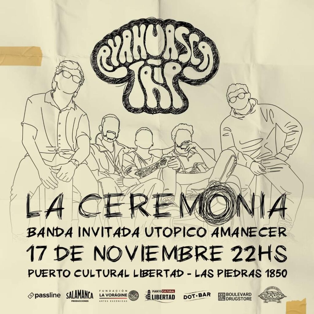 El viernes 17 de noviembre a las 22 hs. se presentará en Puerto Cultural Libertad (Las Piedras 1850), la banda multigenérica Ayahuasca Trip con su show LA CEREMONIA. Como banda invitada subirá al escenario Utópico amanecer.