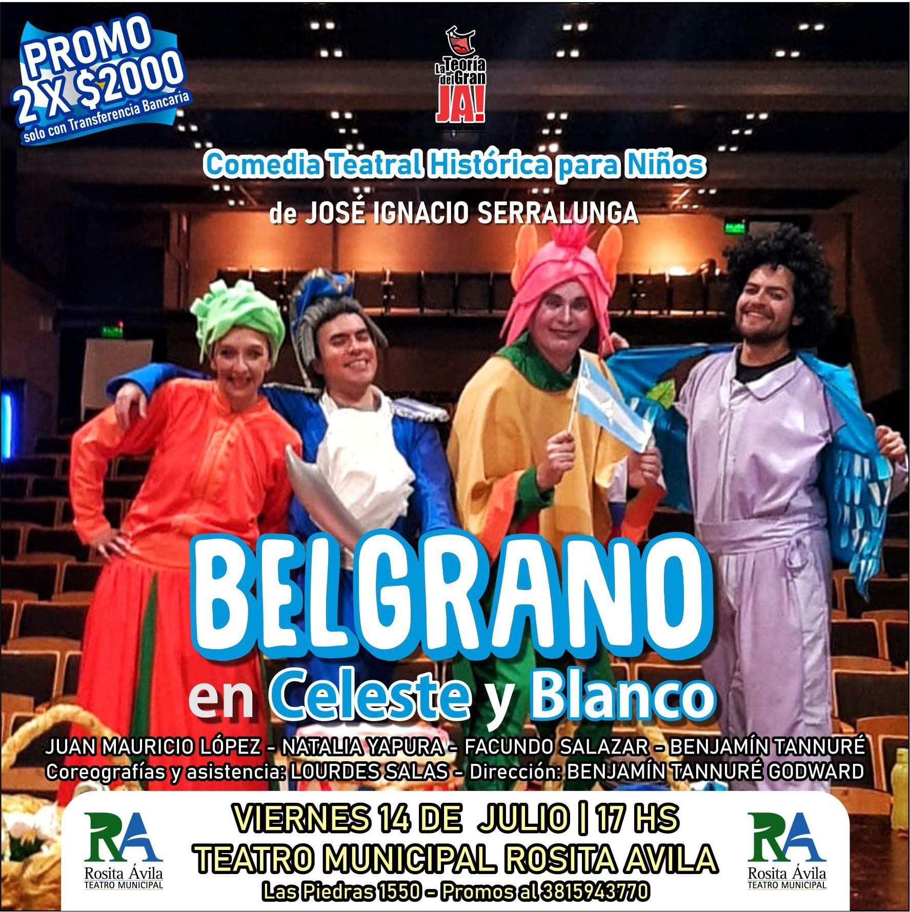La Compañía de Comedias “La Teoría del Gran JA!”, siempre fiel a su estilo dentro del género del humor, presenta la comedia teatral “Belgrano en Celeste y Blanco”, de José Ignacio Serralunga, autor de otras puestas del grupo como Vaya Ramona Vaya y María Polvo de Tiza.