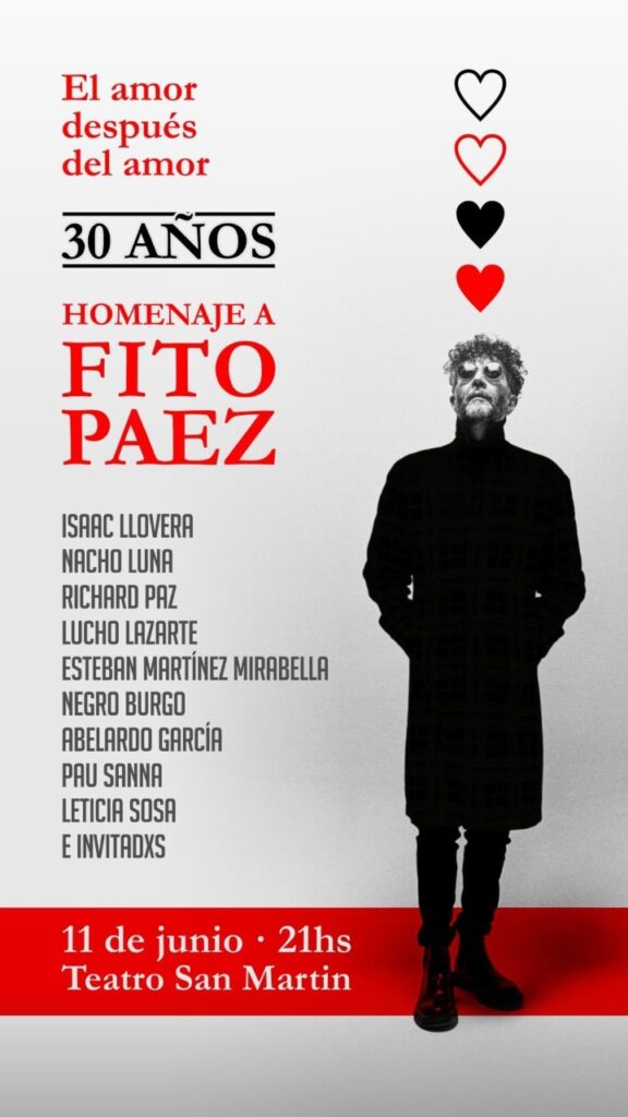 Este sábado 11 de junio a las 21 hs. en el Teatro San Martín (Av. Sarmiento 601), músicas y músicos tucumanos homenajearán a Fito Páez, celebrando los 30 años de su emblemático disco “El amor después del amor”. El show es producido y organizado por Jardín de gente, en el marco del programa El «Teatro para vos» que lleva adelante el Ente Cultural de Tucumán. Entrada general $800; anticipadas $700.