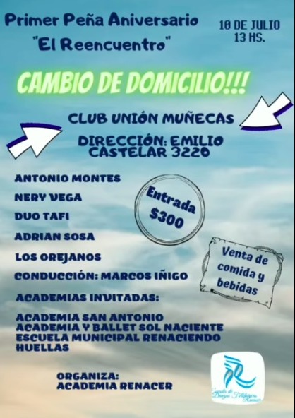 Organizada por la Academia Renacer se llevará a cabo la Primer Peña Aniversario “El Reencuentro” en el Club Unión Muñecas (Emilio Castelar 3220) a partir de las 13 hs.