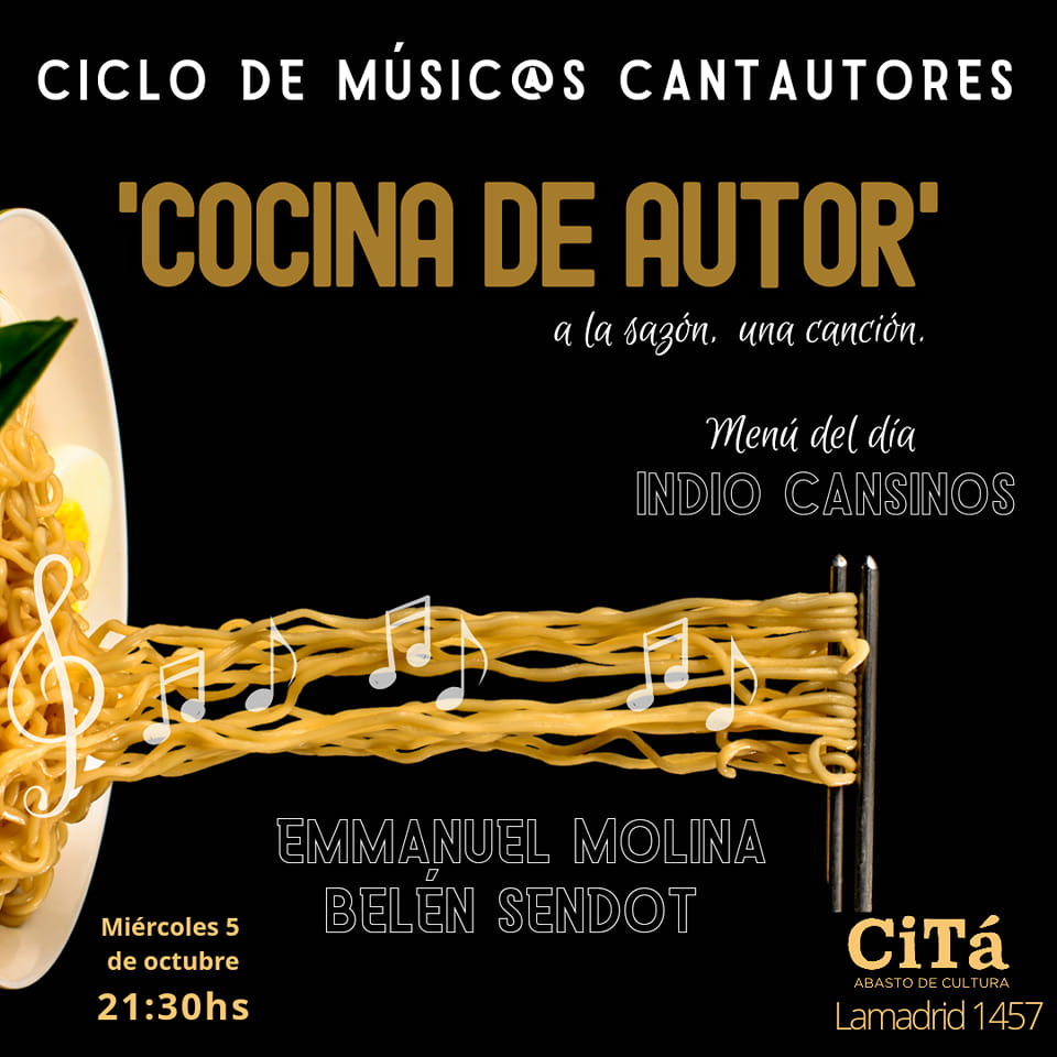 La cita está prevista para este y todos los miércoles de octubre en Citá, Abasto de Cultura (Lamadrid 1457) dónde, se llevará a cabo el ciclo de músic@s de cantautor «Cocina de Autor, a la sazón, una canción».