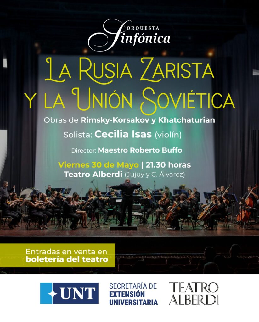 El próximo viernes 30 de mayo la Orquesta Sinfónica de la UNT presentará «La Rusia Zarista y la Unión Soviética», a las 21.30 h en el Teatro Alberdi (Av. Jujuy y Crisostomo). El concierto estará dirigido por el Mtro Roberto Buffo y tendrá como solista a la prestigiosa violinista Cecilia Isas.