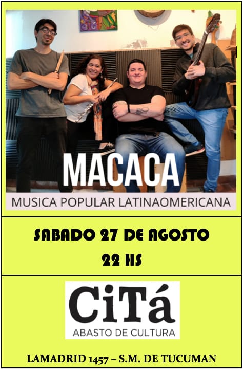Este sábado 27 a las 22 hs (puntual) el grupo Macaca presentará un repertorio con la mejor música latinoamericana en CiTá, Abasto de Cultura (Lamadrid 1457).