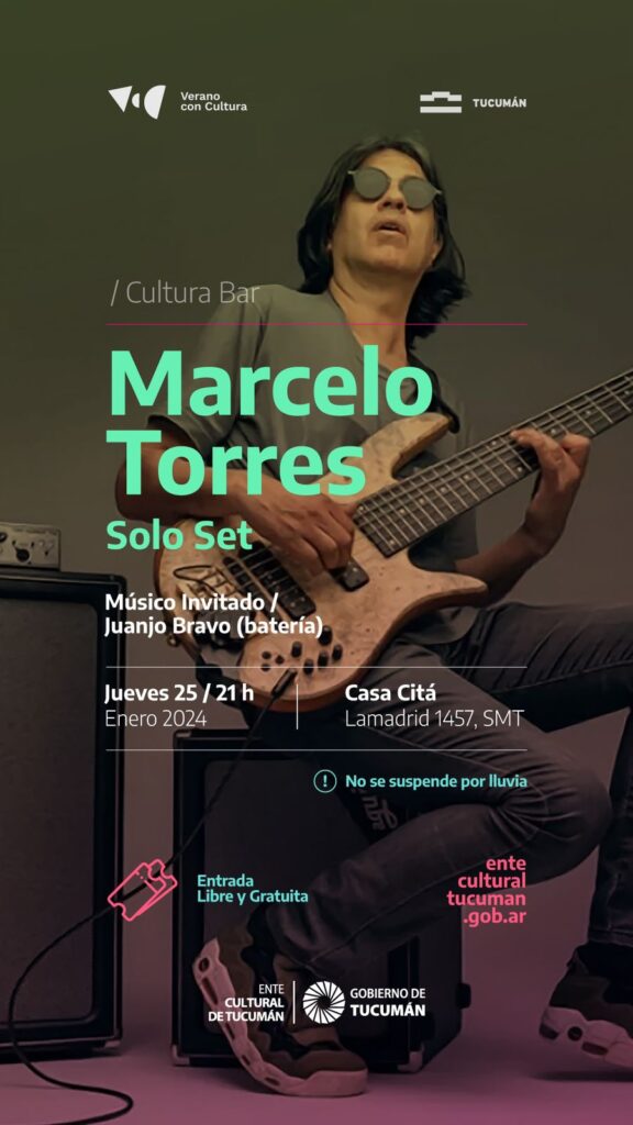 La cita está prevista para este jueves 25 de Enero a las 21 hs en Citá, Abasto de Cultura (Lamadrid 1457) con entrada libre y gratuita dónde, el destacado bajista porteño Marcelo Torres, ex músico de Luis Alberto Spinetta, se presentará en formato Solo Set (bajo de 6 cuerdas MIDI, loops, piano y voz).