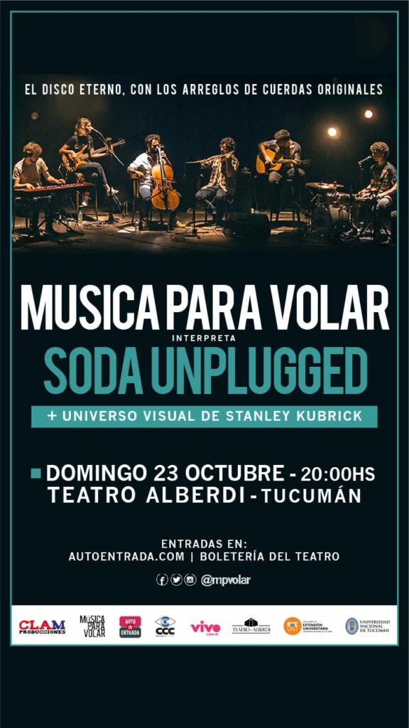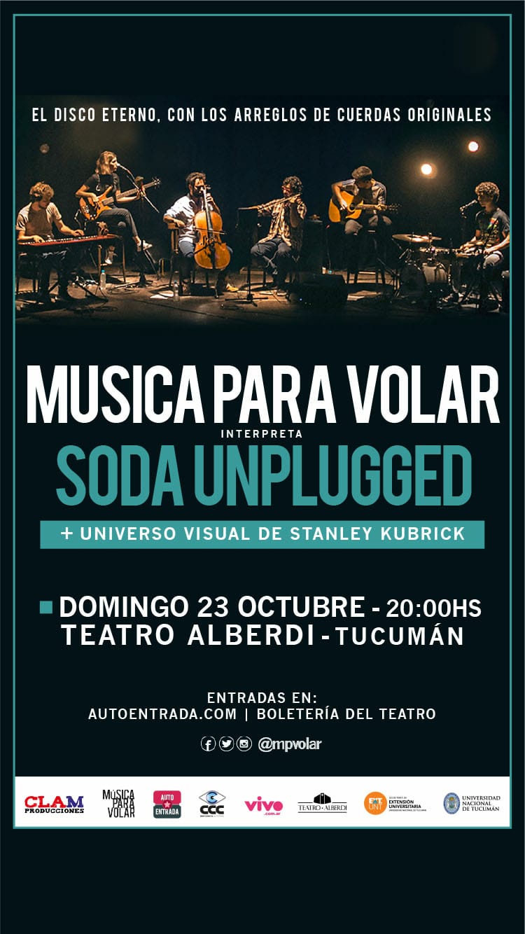 Música Para Volar vuelve a Tucumán a presentar «Soda Unplugged + Universo Visual de Stanley Kubrick», en el cual interpretarán en forma íntegra el disco Unplugged de Soda Stereo, con los arreglos de cuerdas originales y una puesta que combina los momentos musicales con proyecciones sincronizadas de la filmografía de Stanley Kubrick.
