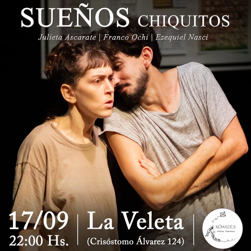 La obra «Sueños Chiquitos» sube a escena este sábado 17 de septiembre a las 22 hs. en La Veleta Cultural (Crisostomo Alvarez 124) por penúltima vez.