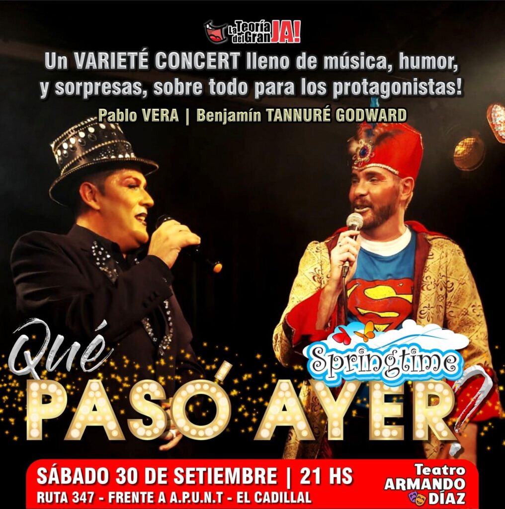 “Qué pasó ayer? Springtime” es una nueva versión del espectáculo de varieté concert, que tuvo una exitosa temporada a sala llena todo el mes de enero y febrero, y que ahora se presenta por única vez este sábado 30 de setiembre, a las 21 en la sala ubicada en Ruta 347, frente a APUNT.