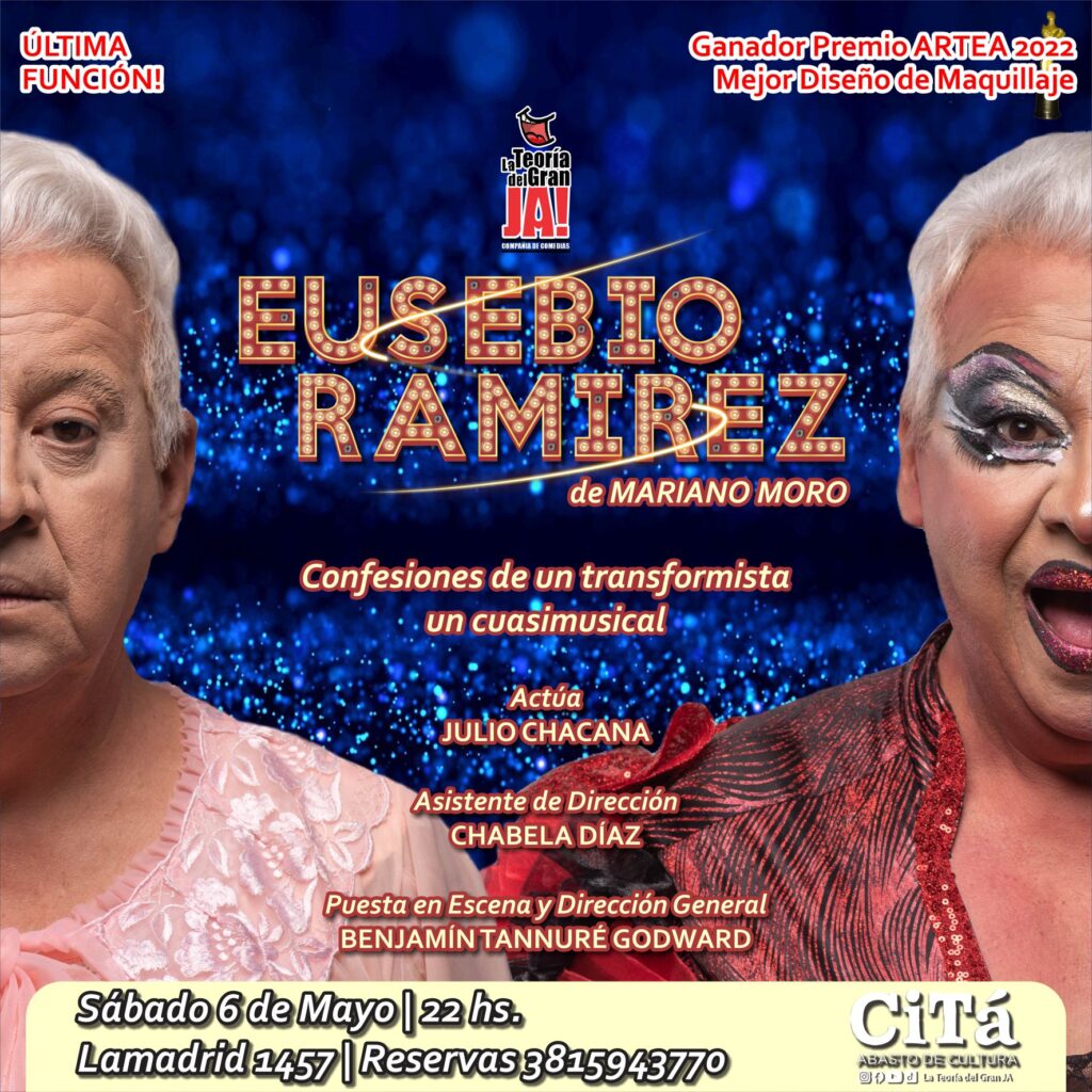“Eusebio Ramírez” es una obra que busca interpelar al espectador desde la empatía. De la intimidad de su casa al show, el transformista compartirá sus experiencias más sensibles mientras ensaya su show. Según sus propias palabras, en el transformismo hizo historia y dejó huella. Como público nunca podremos saber si esto es verdad, pero sí podremos disfrutar de su arte como su auditorio imaginario.