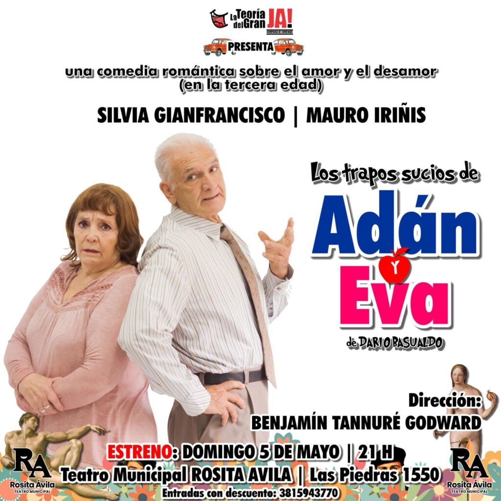 Este domingo 5 de mayo, a las 21 h, se estrena en Tucumán “Los trapos sucios de Adán y Eva” de Darío Basualdo, en la sala del Teatro Municipal Rosita Ávila (Las Piedras 1550).