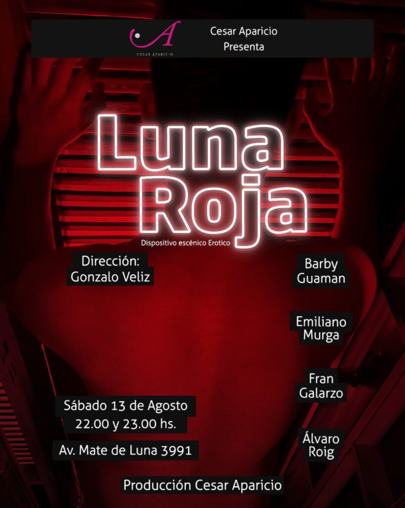“Se miran, se presienten, se desean, se acarician, se besan, se desnudan… se desmayan, reviven, resplandecen, se contemplan, se inflaman, se enloquecen, se rehúyen, se evaden y se entregan», esa es la sinopsis de “Luna roja”, el dispositivo escénico erótico pensado para mayores de 18 años que se presentará en dos funciones únicas, hoy a las 22 y a las 23 hs. en avenida Mate de Luna 3.991.