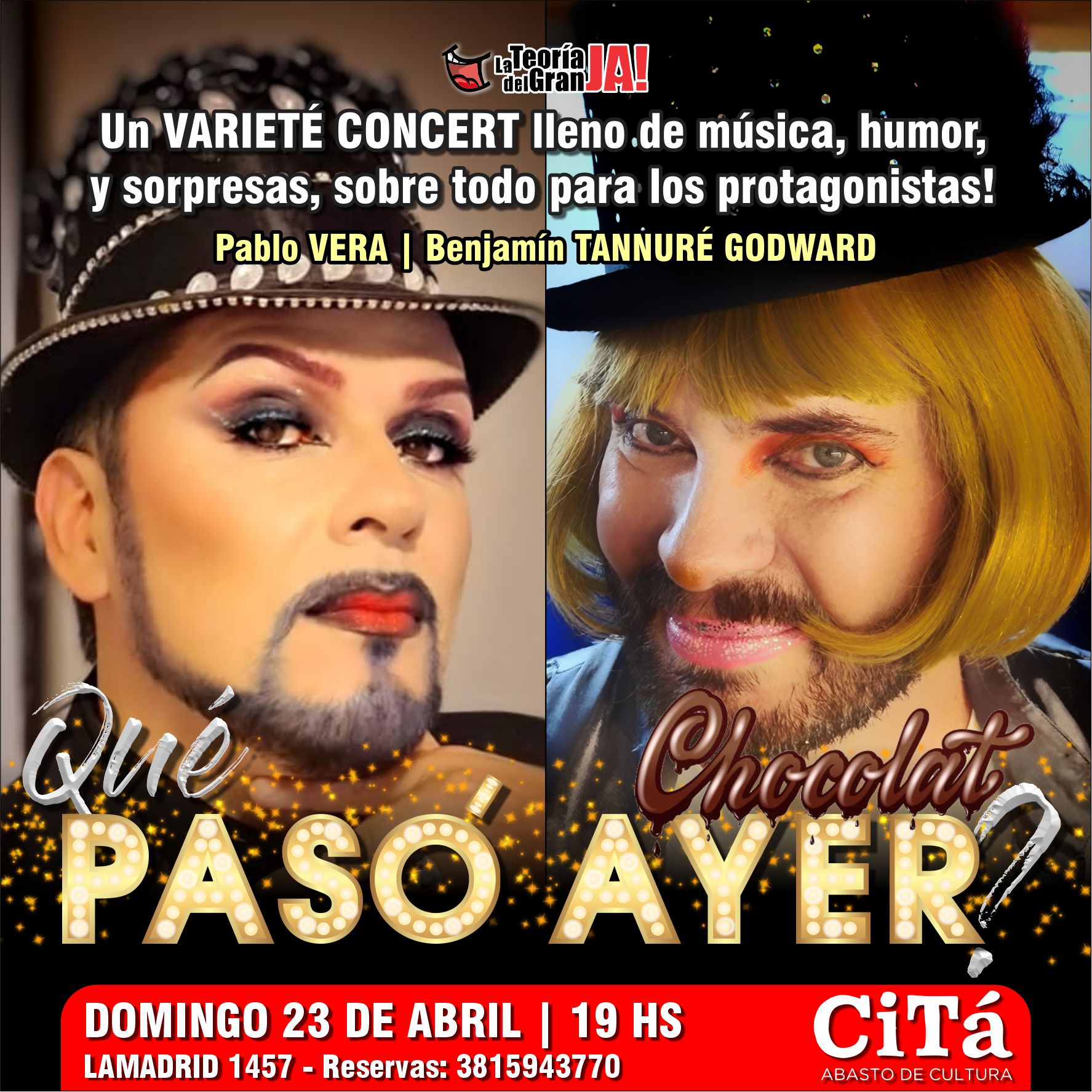 “Qué pasó ayer? Chocolat” es una nueva versión del espectáculo de varieté concert, que ya tuvo una exitosa temporada a sala llena todo el mes de enero y febrero, y que ahora a pedido del público agrega una presentación este domingo 23 de abril, a las 19 hs., nuevamente en Citá Abasto de Cultura (Lamadrid 1457).