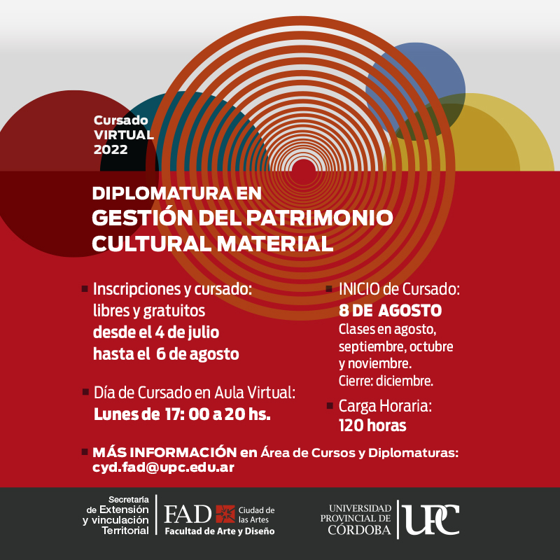La Facultad de Arte y Diseño de la Universidad Provincial de Córdoba, desde el Área de Cursos y Diplomaturas, anuncia el inicio de las inscripciones para la cohorte 2022 de la Diplomatura de Gestión del Patrimonio Cultural Material.