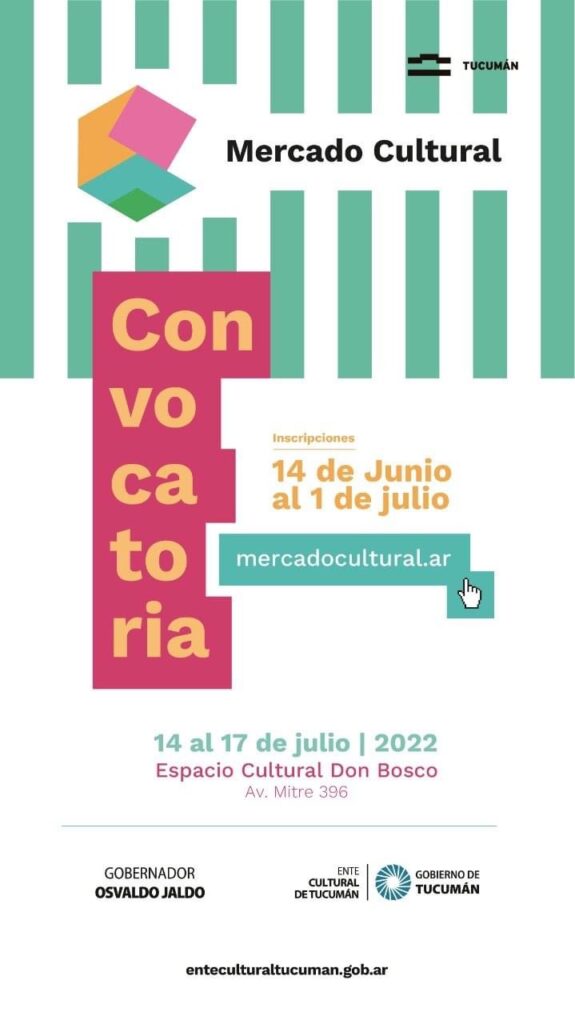El Ente Cultural de Tucumán convoca a colectivos de producción artística de la provincia de Tucumán a postularse para la nueva edición del Mercado Cultural, evento que se realizará del 14 al 17 de julio de 2022 en el Espacio Cultural Don Bosco (Av. Mitre 396).